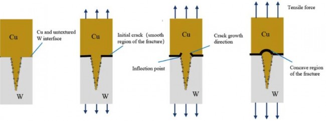鎢-銅異種金屬斷裂機(jī)理示意圖如圖4所示,縱向拉伸變形時(shí)裂紋起源于未激光織構(gòu)化鎢與增材制造銅的接觸表面,加載力增大后,裂紋進(jìn)一步擴(kuò)展至嵌入鎢內(nèi)部的銅,實(shí)驗(yàn)數(shù)據(jù)表明接頭拉伸斷裂強(qiáng)度接近擴(kuò)散焊接鎢-銅接頭。值得注意的是,互鎖接頭力學(xué)性能可以通過(guò)優(yōu)化鎢表面結(jié)構(gòu)以及界面銅增材制造工藝獲得進(jìn)一步提升。